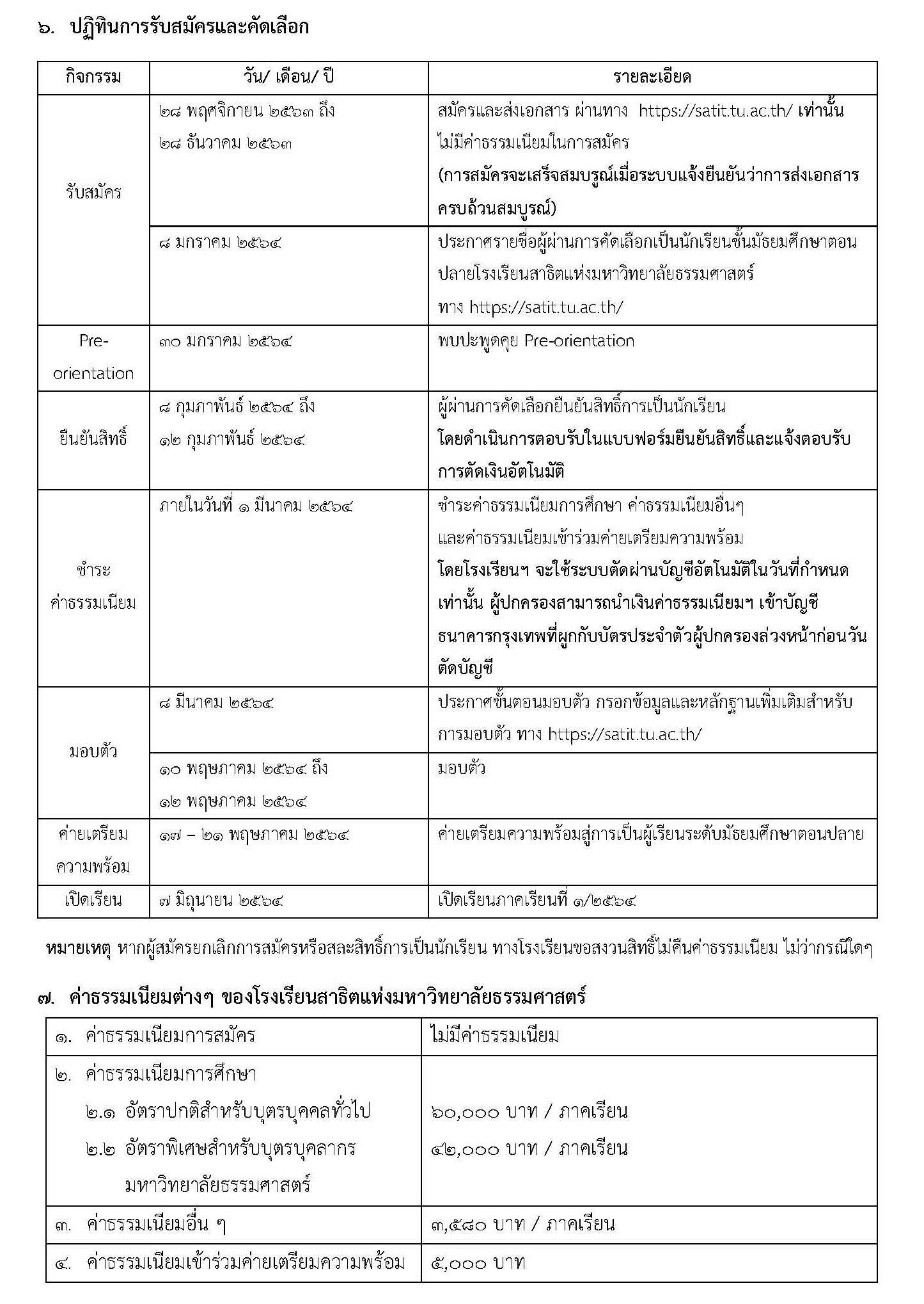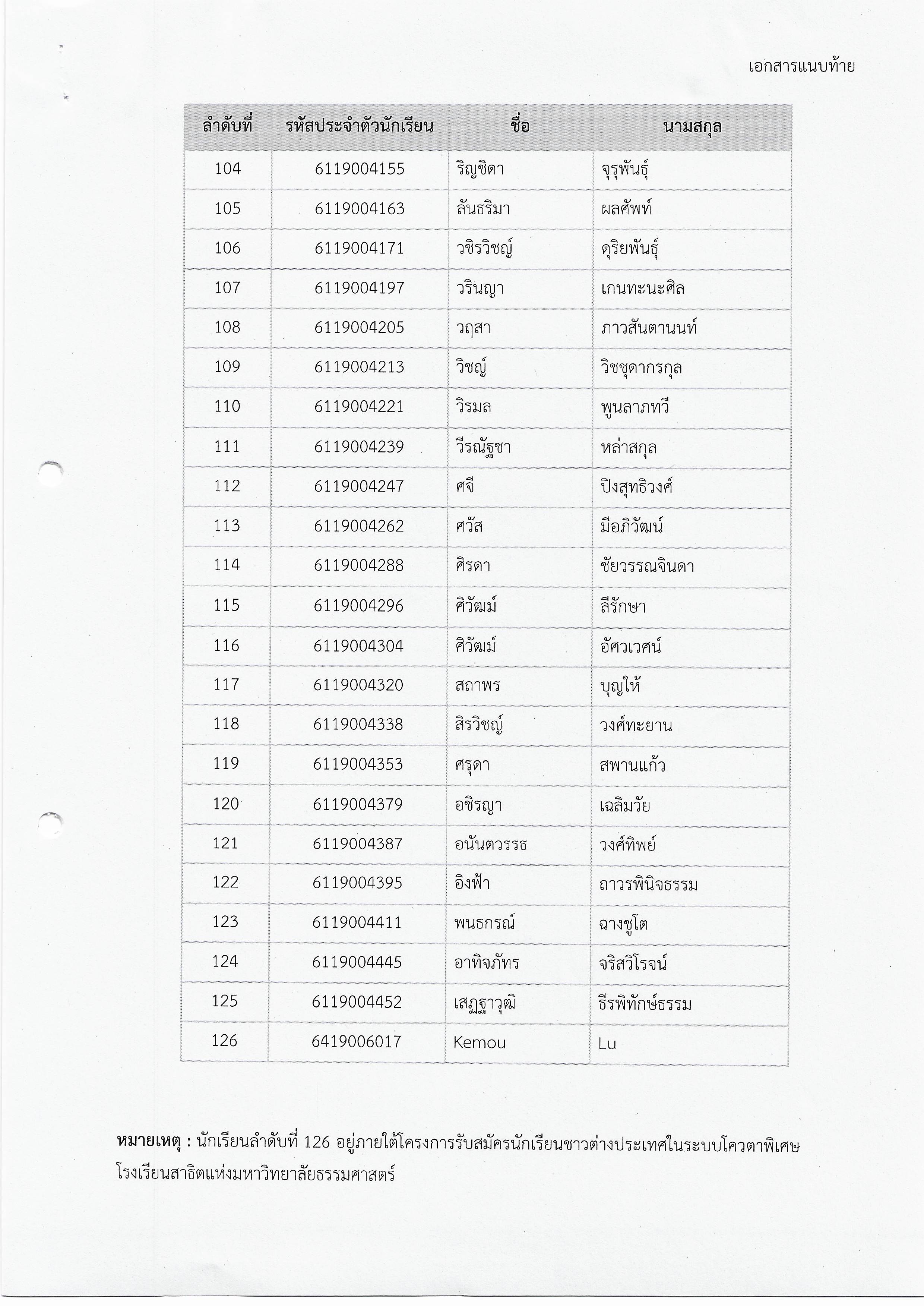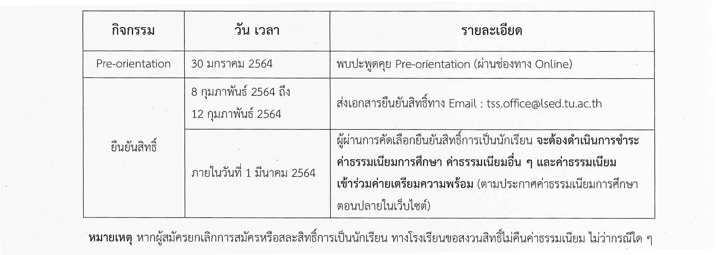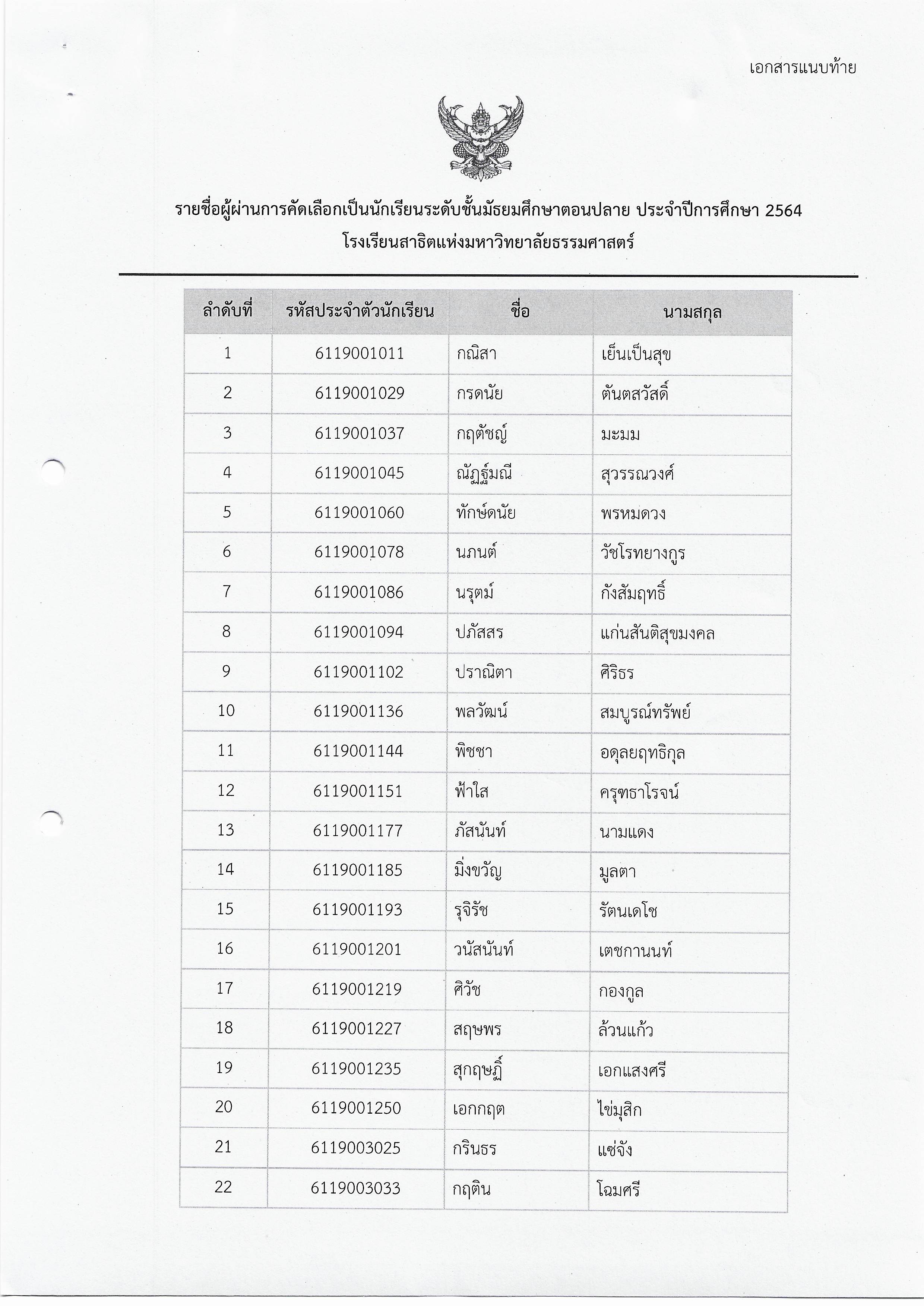 บัดนี้ กระบวนการคัดเลือกนักเรียน และการ Pre-Orientation เพื่อเข้าศึกษาในระดับชั้นมัธยมศึกษาตอนปลาย ดำเนินการเสร็จสิ้นเรียบร้อยแล้ว โรงเรียนสาธิตแห่งมหาวิทยาลัยธรรมศาสตร์ จึงขอประกาศรายชื่อผู้ผ่านการคัดเลือกเป็นนักเรียนระดับชั้นมัธยมศึกษาตอนปลาย ประจำปีการศึกษา 2564 จำนวน 126 คน ตามเอกสารแนบท้าย